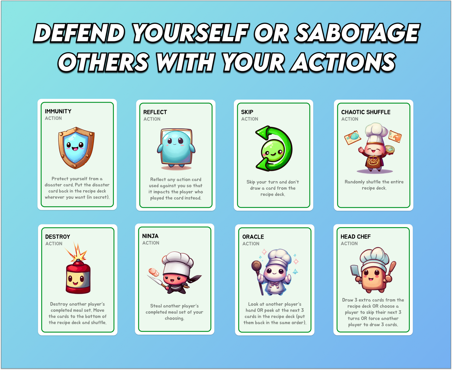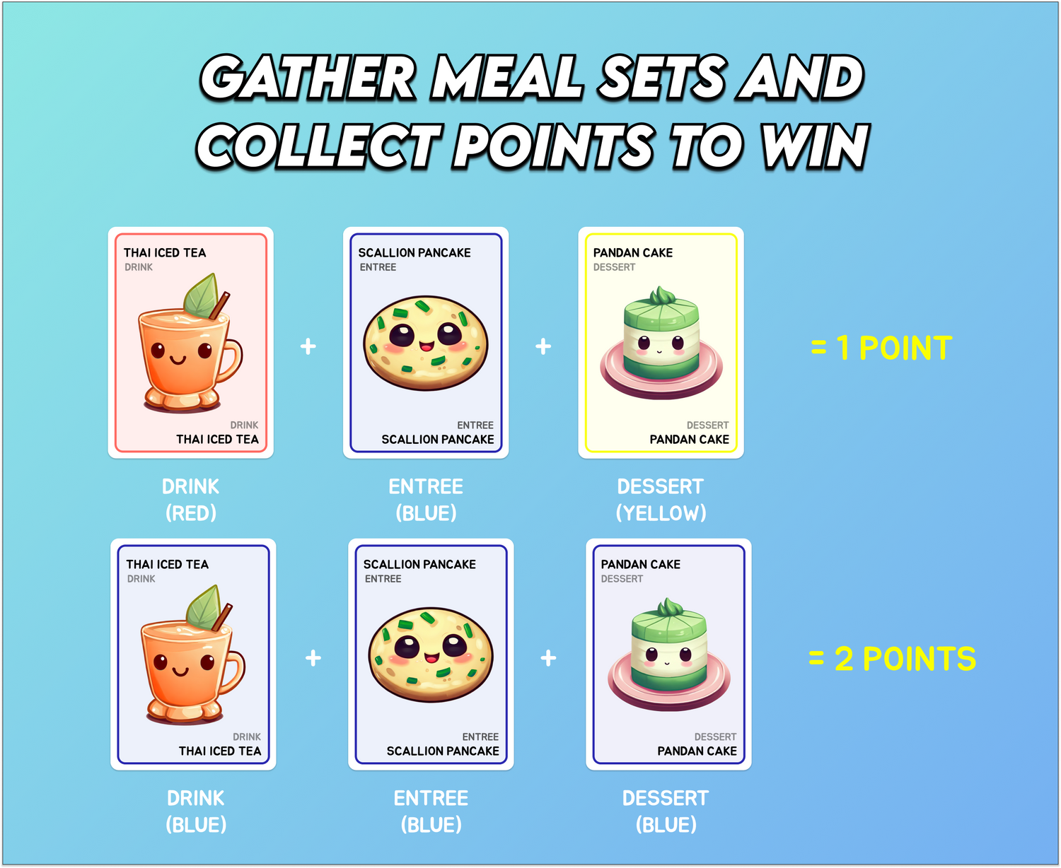 You earn points for completing a meal set consisting of a drink card, entree card, and dessert card.